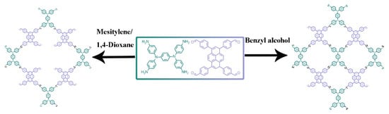 COFs were synthesized using the solvothermal method. Typically, TFPPY (24.7 mg, 0.04 mmol), TPDA (9.45 mg, 0.02 mmol), and two different solvent systems, one as a mixture of 1,4-dioxane and mesitylene (1/1, 1 mL) and the other as MeOH (1 mL), were mixed in a Pyrex tube (10 mL) and sonicated for 10 min to obtain a homogeneous dispersion solution. After sonication for 10 min, 0.1 mL of 6 M aqueous acetic acid was added to the solution. The tube was degassed through the typical three freeze–pump–thaw cycles with liquid nitrogen, and it was sealed with butane flames and then heated at 120 °C for 7 days. The dark red precipitate was collected through filtration and rinsed with DMF, THF, and acetone. The precipitates were collected and vacuum-dried at 120 °C for 4 h.