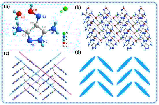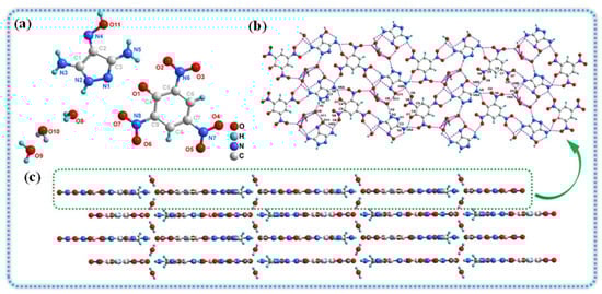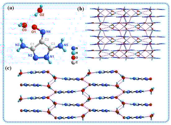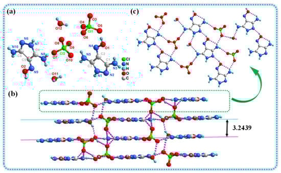 DAPOT crystallizes in the orthorhombic triclinic space group Pbcm with four molecules per unit cell (Z = 4) with a density of 1.701 g·cm−3 (Figure 4a). As shown in Figure 4b, three adjacent cations are bonded by hydrogen bonds (N5−H5A…O1 2.035 Å, N5−H5A…O2 2.191 Å, N3−H3A…O4 2.225 Å, O9−H9A…O3 2.079 Å, O11−H11…O8 1.813 Å, N5−H5A…O1 2.035 Å, and N2−H2…O8 1.891 Å) on the same layer. Figure 4c shows the layered crystal stack of DAPOT·H2O, which uses H2O as a bridge to stabilize the 3D structure through strong intramolecular hydrogen bond (O−H...O). The layers are stacked into a layered structure with a distance of 3.1695 Å, which can be regarded as a typical structure according to the face-to-face π–π interaction (<3.40 Å) [24].