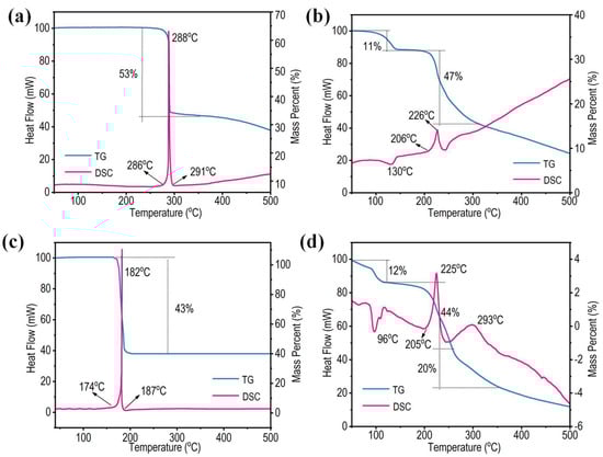 DSC and TG curves of DAPO (a), DAPOC·H2O (b), DAPOP (c), and DAPOT·3H2O (d).