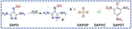 Using malononitrile as raw materials, 3,5-diamino-4H-pyrazol-4-one oxime (DAPO) was synthesized by a three-step reaction [22,23], and the synthetic route of the three salts is in Scheme 1: