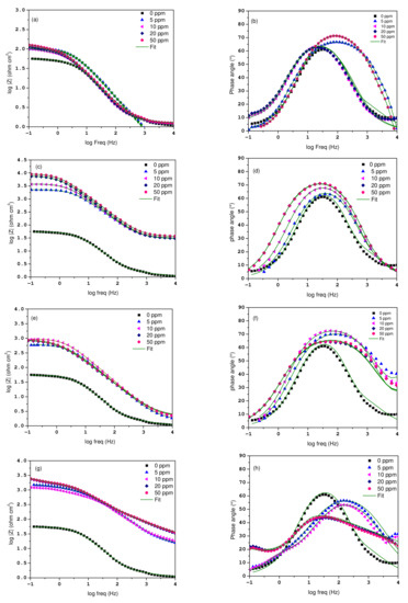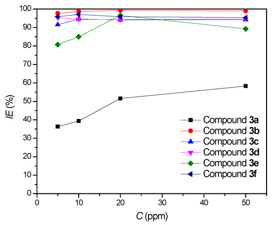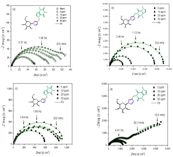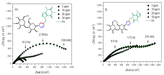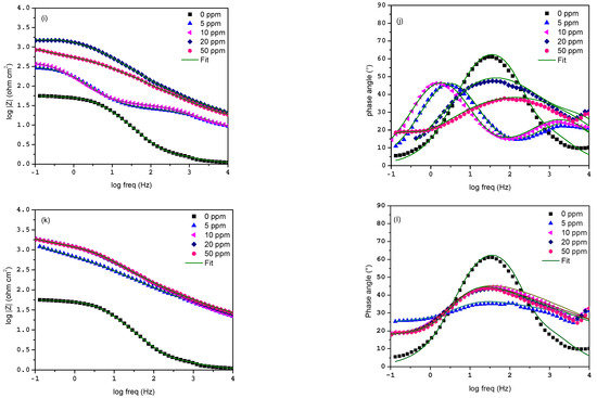 | C (ppm) | Rs (Ω cm2) | n | Cdl (µF/cm2) | Rct (Ω cm2) | Rmol (Ω cm2) | Rp (Ω cm2) | IE (%) | χ2 | |