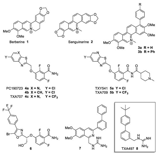 Antibacterial compounds known to target FtsZ are eg Berberine 1 and Sanguinarine 2 (Figure 1). Berberine 1 is a natural plant alkaloid that has been described to target E. coli FtsZ [,]. It binds to FtsZ with high affinity in a region that overlaps with the GTP binding site of FtsZ, inhibits FtsZ GTPase activity, and destabilises FtsZ protofilaments []. However, it showed only weak antibacterial activity against Gram-positive and Gram-negative species in recent studies [,]. Sanguinarine 2 is another, structurally similar, natural plant alkaloid that possesses inhibitory activity against several microorganisms, including MRSA []. The optimised derivatives 3a,b showed more enhanced potency []. In recent years, a number of compounds have been reported that modulate the assembly/disassembly dynamics of FtsZ, some of which have shown very promising antibacterial activity against important human pathogens and are efficacious even in in vivo models of infection. Benzamide derivative PC190723 4a was identified as an FtsZ inhibitor with antibacterial activity against staphylococci, including multidrug-resistant S. aureus, with minimal inhibitory concentrations (MICs) in the range of 0.5–1.0 µg/mL []. PC190723 4a was also effective in a murine septicaemia model of staphylococcal infection and was, thus, the first FtsZ inhibitor with reported in vivo efficacy [,]. The closely related analogue 4b showed an improved MIC of 0.25 µg/mL against S. aureus, albeit with an inferior pharmacokinetic profile [,]. To improve efficacy, prodrug derivative 5a was developed but showed dechlorination and monooxygenation as a metabolic pathway, a possibility eliminated in 5b by the introduction of CF3 instead of Cl [,,]. Compound 6, a recently reported advanced derivative of PC190723 4a, showed improved antibacterial activity with an average MIC of 0.12 µg/mL against S. aureus and S. epidermidis and high oral bioavailability [,].