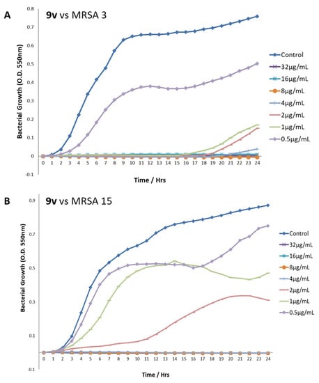 Growth profiles of MRSA strains 3 and 15 after treatment with different concentrations of compound 9v. (A) 9v vs. MRSA 3. (B) 9v vs. MRSA 15.
