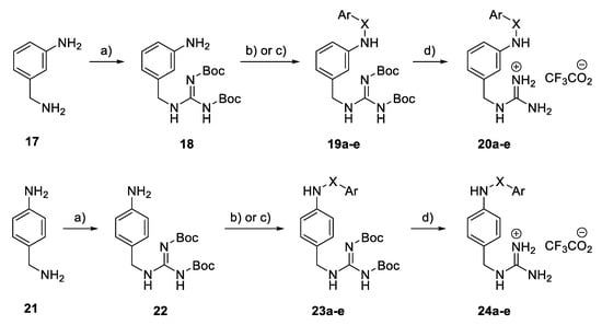In a benzylguanidine-based structural subset, the meta- and para-substituted compounds 20a–e and 24a–e (Scheme 2) were constructed from 3- and 4-aminomethylaniline 17 and 21 via a guanylation reaction using Boc-protected S-methylisothiourea, followed by the treatment of the resulting 18 and 22, respectively, with the corresponding arylsulfonyl chloride or benzoyl chloride in the presence of a base to achieve Boc-protected derivatives 19a–e and 23a–e. Treatment with trifluoroacetic acid in dichloromethane led to the removal of the Boc groups, and the final compounds 20a–e and 24a–e were obtained as their guanidinium trifluoroacetate salts.