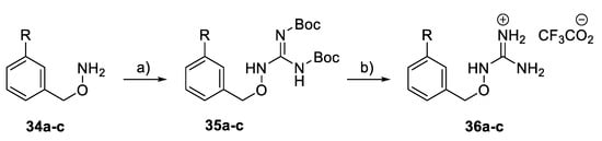 Synthesis of benzyloxy guanidine derivatives 36a–c. Reagents and conditions: (a) BocN=C(SMe)-NHBoc, Et3N, DMF, rt; (b) TFA, CH2Cl2, rt.