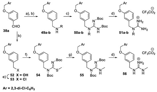 For a subset of benzyl guanidine derivatives 51a–b and 56 (Scheme 7), the reductive amination reaction of the aldehyde 38a (Ar = 2,3-dichlorophenyl) generated the amino intermediates 49a–b, which underwent a guanylation reaction to form the N,N′-di-Boc protected guanidine derivatives 50a–b. Deprotection of the Boc groups generated the guanidinium trifluoroacetate salts 51a–b. The intermediate 53 was obtained through the reduction of the aldehyde 38a, followed by halogenation of the resulting benzyl alcohol 52. Treatment of 53 with S-methyl-N,N′-bis(tert-butoxycarbonyl)isothiourea under basic conditions gave 54. Nucleophilic substitution of 54 with methylamine afforded the N,N′-di-Boc protected guanidine 55, which was then hydrolysed in TFA to give the final compound 56.