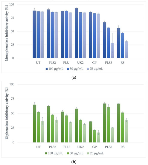 The tyrosinase inhibitory activity of each propolis sample was tested at three concentrations of 25.00, 50.00, and 100.00 µg/mL (Figure 1). The most significant mushroom monophenolase tyrosinase inhibition activity (Figure 1a) at 100.00 µg/mL was detected for sample UK2 (93,25% of inhibition), followed by samples PLS2, UT, and GP, showing 90.93%, 88.70%, and 86.55% of inhibitory activity, respectively. At the concentration of 50.00 µg/mL, the strongest inhibitory activity was shown for the PLU sample (88.40%) and successively for UT (87.35%), PLS2 (86.37%), UK2 (85.75%), and GP (83.00%) propolis extracts. The activity of five of the most effective propolis extracts (UT, PLS2, PLU, UK2, and GP) at the concentration of 25.00 µg/mL was similar and in the range of 83.15–86.90% (the UT sample showed the highest inhibition level of these five). The least active propolis samples, PLS3 and RS, inhibited the monophenolase activity of tyrosinase, respectively, by 67.04%, 57.03%, 28.74% and 56.03%, 47.13%, 31.27% at the tested concentrations (100.00; 50.00 and 25.00 µg/mL).
