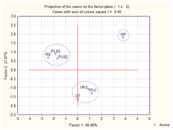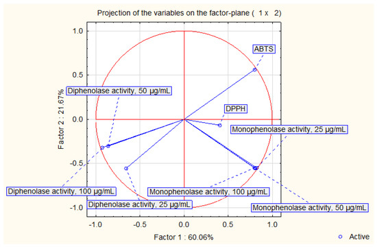 The principal component analysis (Figure 2 and Figure 3) exhibited that 81.73% of variability may be explained in a two-factor model. Factor 1 explained 60.06%, while factor 2 explained 21.67% of the variability. Samples may be divided into three groups in Figure 3. The observed division was not accurately corresponding with the plant origin or the biological activities.