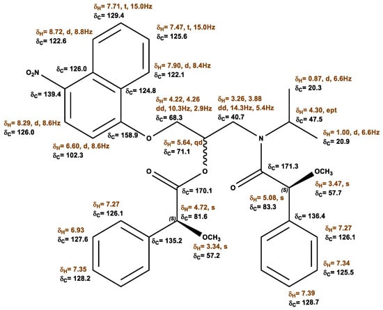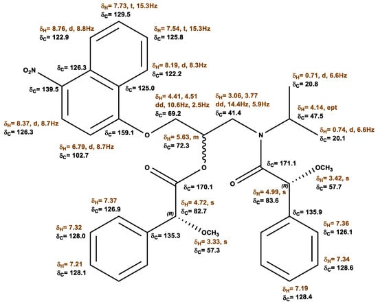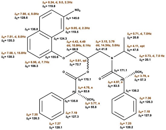 Each pure enantiomer was converted into the relevant MPA derivative by applying the double derivatization method proposed by Riguera and coworkers, which is based on the use of both R and S enantiomer of the α-methoxyphenylacetic acid [,]. In detail, a portion of the pure nitro propranolol compounds ((+)-2a, (−)-2a, (+)-2b, and (−)-2b) was dissolved in dry dichloromethane (1mL). To this solution, 2.2 equivalent (eq.) of either (R)-(−)-α-methoxyphenylacetic acid or (S)-(+)-α-methoxyphenylacetic acid, 2.2 eq. of 1-ethyl-3-(3-dimethylaminopropyl)carbodiimide (EDC), and a catalytic amount of DMAP were added. The mixture was stirred overnight at room temperature (rt) before removing the solvent under vacuum. Each residue was separately purified by HPLC on silica gel (Luna 3-µM SiO2 column, flow rate 0.5 mL/min, mobile phase n-hexane/ethyl acetate 6:4 v/v) providing the desired compounds in pure form. The reaction conditions and yields are summarized in Table 2. 1H NMR and 13C NMR shifts were assigned by HSQC and HMBC experiments and are reported in Figure 2, Figure 3, Figure 4, Figure 5, Figure 6, Figure 7, Figure 8, Figure 9, Figure 10, Figure 11, Figure 12 and Figure 13.