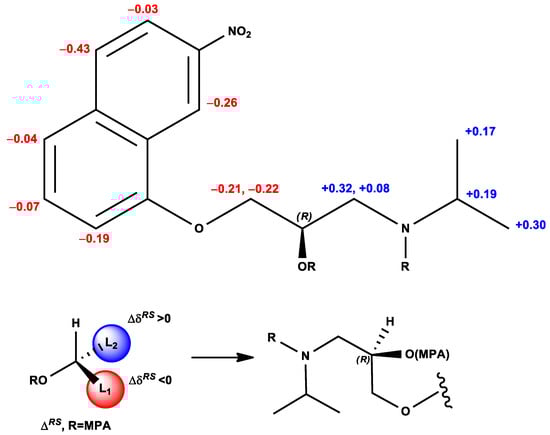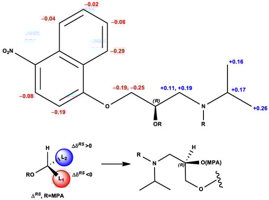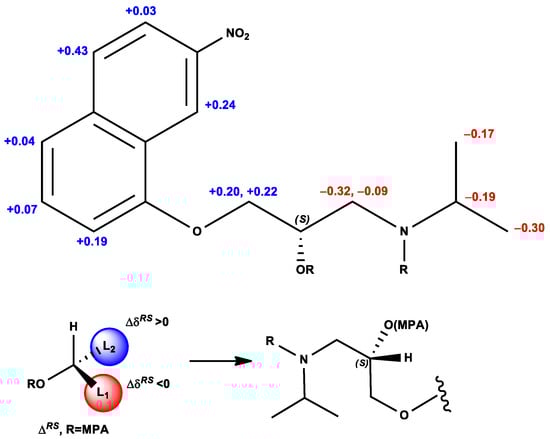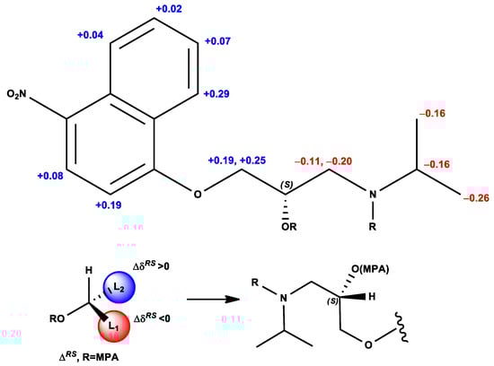 Applying Riguera’s method [,], by double derivatization procedure, for assigning the absolute configuration of secondary alcohol based on the sign distribution of ΔδH (calculated as δHR − δHS) allowed assigning S configuration to the (+)-4-NO2-propranolol (Figure 4).
