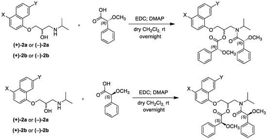 Each optically pure derivative (+)-4-nitropropranolol, (−)-4-nitropropranolol, (+)-7-nitropropranolol, and (−)-7-nitropropranolol), respectively named as (+)-2a, (−)-2a, (+)-2b, and (−)-2b, was reacted both with (R)-(−)-α-methoxyphenylacetic acid and (R)-MPA and with (S)-(+)-α-methoxyphenylacetic acid and (S)-MPA, which has been proven to be a chiral derivatizing agent (CDA) of choice for alcohols [,].