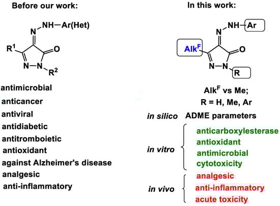 4-Arylhydrazinylidene-5-(polyfluoroalkyl)pyrazol-3-ones (4-AHPs) were found to be obtained by the regiospecific cyclization of 2-arylhydrazinylidene-3-(polyfluoroalkyl)-3-oxoesters with hydrazines, by the azo coupling of 4-nonsubstituted pyrazol-5-oles with aryldiazonium chlorides or by the firstly discovered acid-promoted self-condensation of 2-arylhydrazinylidene-3-oxoesters. All the 4-AHPs had an acceptable ADME profile. Varying the substituents in 4-AHPs promoted the switching or combining of their biological activity. The polyfluoroalkyl residue in 4-AHPs led to the appearance of an anticarboxylesterase action in the micromolar range. An NH-fragment and/or methyl group instead of the polyfluoroalkyl one in the 4-AHPs promoted antioxidant properties in the ABTS, FRAP and ORAC tests, as well as anti-cancer activity against HeLa that was at the Doxorubicin level coupled with lower cytotoxicity against normal human fibroblasts. Some Ph-N-substituted 4-AHPs could inhibit the growth of N. gonorrhoeae bacteria at MIC 0.9 μg/mL. The possibility of using 4-AHPs for cell visualization was shown. Most of the 4-AHPs exhibited a pronounced analgesic effect in a hot plate test in vivo at and above the diclofenac and metamizole levels except for the ones with two chlorine atoms in the aryl group. The methylsulfonyl residue was proved to raise the anti-inflammatory effect also. A mechanism of the antinociceptive action of the 4-AHPs through blocking the TRPV1 receptor was proposed and confirmed using in vitro experiment and molecular docking.