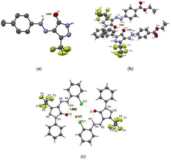 We grew monocrystals for 4-AHPs 5b, 6b,g to elucidate their structure by XRD analysis (Figure 2a–c), which confirmed their structure as 5-RF-regioisomers, existing in a Z-hydrazone amide (HA) tautomeric form in crystals. The stabilization of the Z-HA isomers was realized through the intramolecular hydrogen bond (IHB) formation between the proton of the NH group of the arylhydrazone substituent and the carbonyl oxygen atom of the pyrazole fragment (O2⋯H3 2.045 Å for 5b, H4⋯O3 and H4A⋯O3A 2.043 and 2.019 Å for 6c (two crystallographically independent molecules), (Figure 2a,b)). In pyrazolone 6g (Figure 2c), in addition to a similar IHB (H4⋯O1 1.992 Å), the formation of intermolecular chlorine–oxygen bonds (Cl1⋯O1’ 3.177 Å) was revealed leading to molecule dimerization.