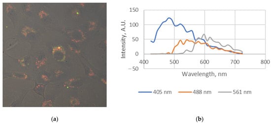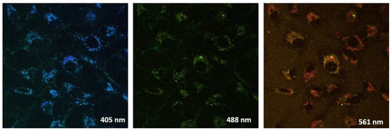 It is interesting that the fluorescence intensity of this substance was sufficient to obtain a relatively high-quality image by a 561 nm laser excitation followed by the unequal emission in two spectral ranges. The cell structures near the nucleus (likely the Golgi apparatus or part of the endoplasmic reticulum) had an emission in the green-yellow range (561–580 nm), while in the red range (600–650 nm) the emission of granular round formations was monitored (Figure 5).