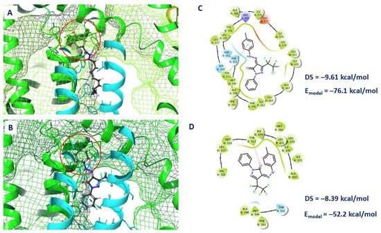 Herein, we investigated the bioactivity potential of polyfluoroalkyl-containing 4-AHPs, varying their structural elements: a polyfluoroalkyl group, an arylhydrazone fragment and a substituent at the cyclic nitrogen atom (Figure 1). The most expected types of biological action of pyrazolones were studied. First of all, we evaluated the esterase profile of the synthesized compounds, including the determination of their inhibitory activity against carboxylesterase (CES, EC 3.1.1.1) and functionally related cholinesterases—acetylcholinesterase (AChE, EC 3.1.1.7) and butyrylcholinesterase (BChE, EC 3.1.1.8), because their precursors, polyfluoroalkyl-containing 2-arylhydrazinylidene-3-oxoesters, inhibit CES [64,65,66,67]. Moreover, effective inhibitors of acetylcholinesterase were found among the non-fluorinated analogues of 4-AHPs [28]. In addition, antimicrobial, antitumor and antioxidant activities and the ability to stain cells were evaluated in vitro; analgesic and anti-inflammatory effects and acute toxicity were determined by in vivo experiments. Molecular docking was carried out to determine the mechanism of the analgesic action. The activity against the transient receptor potential cation channels A1 and V1 was observed.