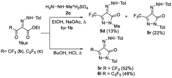 In the reaction of ethyl 2-tolylhydrazinylidene-3-oxo-4,4,4-trifluorobutanoate 1b with methylhydrazine sulfate 2c in refluxing ethanol, not only the expected pyrazole 5d was isolated, but also heterocycle 5r having a tolyl substituent at the N2 nitrogen atom (Scheme 2). Obviously, the product 5r could be formed only upon the cyclization of two molecules of 3-oxoester 1b accompanied by the partial decomposition of one of them. Actually, with the refluxing of ester 1b in ethanol for 24 h in the presence of catalytic amounts of hydrochloric acid, only pyrazole 5r was obtained. However, the incomplete conversion of the starting ester 1b was observed under these conditions. To improve the yield of the target product 5r, different conditions were tested by varying solvents and acid catalysts (EtOH/NaOAc; MeCN/HCl; toluene/p-TSA; CF3CH2OH/HCl; EtOH/TFAA or n-BuOH/HCl). The most efficient conditions were found to be refluxing in n-BuOH with HCl catalysis, which decreased the reaction time to 9 h and increased the yield to 52%. The self-condensation of pentafluoroethyl-substituted 2-tolylhydrazinylidene-3-oxoester 1c also proceeded successfully in n-BuOH in the presence of HCl to give pyrazole 6i (Scheme 2).