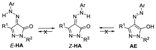 The IR spectra of compounds 5b, 6c,g, registered for a 0.1 M solution of CHCl3 and for the solid state had absorption bands of characteristic vibrations of carbonyl groups at ν 1660–1670 cm–1 that allow us to suggest the presence of the Z-HA form for pyrazoles 5–9 in solutions too. The NMR spectra of heterocycles 5–9 recorded in CDCl3 and DMSO-d6 contained one set of signals, which also corresponds to the Z-isomeric form of the HA tautomer, since the 1H NMR spectra contain downfield proton signals at δ 13–14 ppm of the NNH group that can participate in the IHB formation. Similarly, the signal of the carbon atom of the carbonyl group at δ 157–160 ppm in the 13C NMR spectra was specific for the HA tautomer. According to QC, Z-isomer of pyrazolone 5a is more energetically stable than E-isomer. The difference in Gibbs free energy is 26 kJ/mol (Figure S1, Supplementary Material). Thus, we showed that 4-AHPs are the synthetically available compounds existing in the stable Z-HA form.