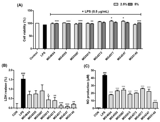 The cytotoxicity of 2.5 and 5% CFS in RAW 264.7 was established by MTT assay (Figure 1A). The results showed that 5% CFS of Lactobacillus and Streptococcus strains showed no cytotoxicity (≥100%) in RAW 264.7 cells. Moreover, LDH release of 5% CFS on LPS-induced RAW 264.7 cells were measured, shown in Figure 1B. All CFS decreased LDH release compared to LPS-induced control. Therefore, NO production was evaluated at 5% CFS, a concentration without cytotoxicity. As shown in Figure 1C, the CFS of all probiotics remarkably inhibited NO production compared to the LPS-induced controls.