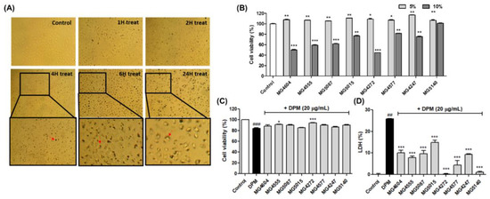 Cell viability and cytotoxicity of DPM treated with or without CFS from Lactobacillus and Streptococcus strains in NCI-H292 cells. The morphology of NCI-H292 cells, treated at different times (1, 2, 4, 6, and 24 h) of DPM, was observed by the microscope (×20, (A)). Red arrows indicate intracellular accumulation of DPM. Cell viability of CFS (B) and CFS with DPM (C) was measured by MTT assay. Cytotoxicity was assessed by lactate dehydrogenase (LDH) release (D). The NCI-H292 cells were pretreated with 5% CFS and then incubated with or only DPM (20 µg/mL) for 24 h. The results indicate the mean ± SEM of three separate experiments. ## p < 0.01, and ### p < 0.001 compared with control and * p < 0.05, ** p < 0.01, and *** p < 0.001 compared with DPM alone.