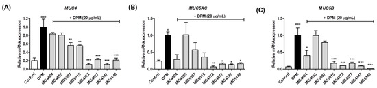 The effect of CFS from Lactobacillus and Streptococcus strains on mRNA expression related to mucus production was confirmed in DPM-induced NCI-H292 cells. It was found that treatment with DPM upregulated all mRNA expressions, whereas treatment with L. paracasei MG4272, MG4577, L. gasseri MG4247, and S. thermophilus MG5140 significantly suppressed MUC4 (0.11-, 0.22-, 0.11-, and 0.21-fold), MUC5AC (0.07-, 0.14-, 0.13-, and 0.15-fold), and MUC5B (0.10-, 0.17-, 0.09-, and 0.02-fold) mRNA expression in NCI-H292 cells (Figure 3).