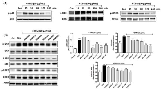To determine the time-dependent effect of each protein, NCI-H292 cells were incubated with DPM. Maximum induction of p-ERK1/2, p-p38 MAPK, and p-CREB protein expression by DPM was observed at 30 min (Figure 4A). The CFS of Lactobacillus and Streptococcus strains was pretreated for 1 h and treated with DPM for 30 min to confirm the expression of each protein in NCI-H292 cells. It was demonstrated that L. paracasei MG4272, MG4577, L. gasseri MG4247, and S. thermophilus MG5140 significantly decreased the expression of p-p38 (0.75, 0.69, 0.48, and 0.42-fold), p-ERK1/2 (0.39, 0.68, 0.44, and 0.58-fold), and p-CREB (0.69, 0.68, 0.78, and 0.61-fold; Figure 4B).