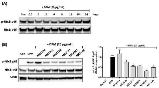 Protein expression of NF-κB phosphorylation in NCI-H292 cells treated with DPM at various time points was measured using western blotting (Figure 5A). Before 8 h of treatment with DPM, there was no change in NF-κB phosphorylation in NCI-H292 cells; however, at 18 and 24 h, there was a gradual increase. As shown in Figure 5B, treatment with CFS Lactobacillus and Streptococcus strains reduced the phosphorylation of NF-κB, except for MG4604, in DPM-induced NCI-H292 cells. L. paracasei MG4272, MG4577, L. gasseri MG4247, and S. thermophilus MG5140 markedly inhibited the protein expression of p-NF-κB (0.54-, 0.57-, 0.32-, and 0.49-fold, respectively) in DPM NCI-H292 cells.