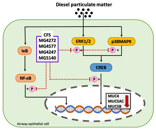 In the present study, CFS from L. paracasei MG4272, MG4577, L. gasseri MG4247, and S. thermophiles MG5140 was effective in modulating inflammation in RAW264.7 and NCI-H292 airway epithelial cells. We demonstrated that L. paracasei MG4272, MG4577, L. gasseri MG4247, and S. thermophilus MG5140 decreased mRNA expression related to mucus production by attenuating the CREB/NF-κB signaling pathway in DPM-induced airway epithelial cells (Figure 6). In conclusion, L. paracasei MG4272, MG4577, L. gasseri MG4247, and S. thermophiles MG5140 may be used as safe dietary supplements to improve airway inflammation, which needs to be proven in further animal studies.