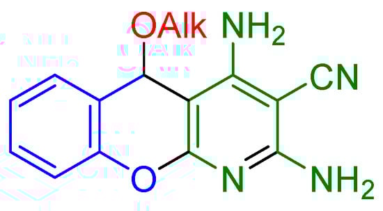 - Vereshchagin, A.N.; Elinson, M.N.; Anisina, Y.E.; Ryzhkov, F.V.; Novikov, R.A.; Egorov, M.P. PASE Pseudo-Four-Component Synthesis and Docking Studies of New 5-C-Substituted 2,4-Diamino-5H-Chromeno[2,3-b]pyridine-3-Carbonitriles. ChemistrySelect 2017, 2, 4593–4597. [Google Scholar] [CrossRef]