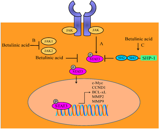 Wealth of information gathered through structural biology and receptor pharmacology has allowed researchers to unlock the mechanisms of cytokine receptor activation, signifying that different aspects of cytokine function are highly tunable. Kinases of Janus kinase family (JAK) and transcriptional factors of STAT (signal transducer and activator of transcription) family are composed of a rapid membrane-to-nucleus signal transduction module that centrally drives carcinogenesis [22,23,24,25]. Binding of different cytokines to their native receptors triggers the phosphorylation of receptor-associated JAKs [26,27]. There are different STAT proteins which act as downstream effectors in JAK//STAT signaling, but available evidence highlights betulinic acid mediated regulation of STAT3 proteins.