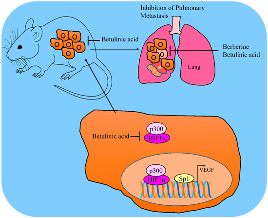 Formulations of natural products exert cancer inhibitory effects and minimum off-target effects. Berberine and betulinic acid in spray dried (SD) mucoadhesive microparticle formulations were prepared and tested for efficacy against animal models orthotopically implanted with A549 cancer cells. Importantly, lung tumor weights were found to be considerably suppressed by berberine and betulinic acid spay-dried formulations. In metastatic lung tumor models, the number of tumor nodules on the surface of medial, peripheral and central lobes were found to be significantly reduced by berberine and betulinic acid. The HIF1α/VEGF pathway was inactivated in the tumor tissues in animal models treated with berberine and betulinic acid [37].