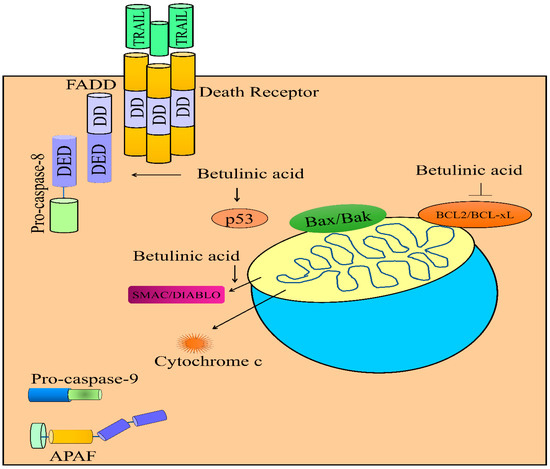 Greater-than-ever knowledge of the role of mitochondria in cell biology has undergone substantial broadening and, intriguingly, scientists uncovered unprecedented roles of mitochondria as key platforms for a plethora of cell signaling pathways. In particular, it was observed that during apoptosis, mitochondria released proteins, such as cytochrome c, SMAC/DIABLO and Omi/HTRA into the cytosol. Bax and Bak permeabilized the outer membranes of mitochondria. Betulinic acid and TRAIL synergistically triggered the release of SMAC/DIABLO and cytochrome c from mitochondria in SHEP neuroblastoma cells. Betulinic acid and TRAIL did not activate apoptotic death in BCL-2 overexpressing SHEP cells [52]. Betulinic acid has also been reported to work efficiently with doxorubicin and potentiate the release of SMAC/DIABLO and cytochrome c from mitochondria in neuroblastoma cells (Figure 3) [53].
