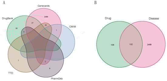 Therapeutic targets of ulcerative colitis were offered by five public databases with the keywords “ulcerative colitis”: Gene Cards (https://www.genecards.org/, accessed on 1 May 2022), Drug Bank (https://go.drugbank.com/, accessed on 1 May 2022), Pharm GKB (https://www.pharmgkb.org/, accessed on 1 May 2022), Therapeutic Target Database (TTD, http://db.idrblab.net/ttd/, accessed on 1 May 2022), and Online Mendelian Inheritance in Man (OMIM, https://omim.org/, accessed on 1 May 2022). All targets were filtered as “homo sapiens”.