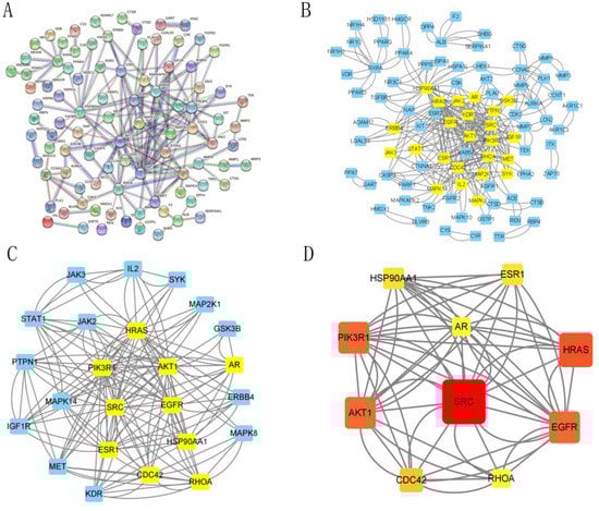 PPI network of BDMC-UC. (A) The interactive PPI network derived from STRING database. (B) PPI network obtained from STRING database to Cytoscape3.8.0. (C) PPI network of more important proteins extracted from (B) by filtering six parameters: BC, CC, DC, EC, NC, and LAC. (D) Core PPI network of key proteins extracted from (C). Higher degree values indicate larger node sizes, red represents a higher degree, and yellow represents a lower degree.