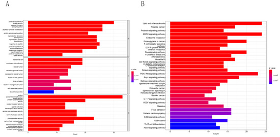 (A) The bar plot diagram of GO analysis of BDMC-UC, including the top 10 important enrichment terms of BP, CC, and MF. Redder means lower q value. (B) KEGG enrichment analysis for the major target of BDMC (top 30). Redder means lower q value.