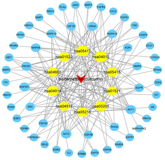 The construction BDMC-target-pathway network. The red inverted triangles represent BDMC, the blue ellipses represent target genes, and the yellow hexagons represent the top 10 KEGG pathways of BDMC treating UC. The gray lines represent their interaction.