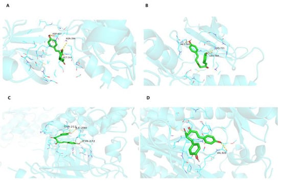 Molecular docking models of BDMC binding to major hub targets. (A) SRC with BDMC. (B) EGFR with BDMC. (C) AKT1 with BDMC. (D) PI3KR1 with BDMC. The yellow dashed lines represent hydrogen, whereas the red lines represent π-π interactions.