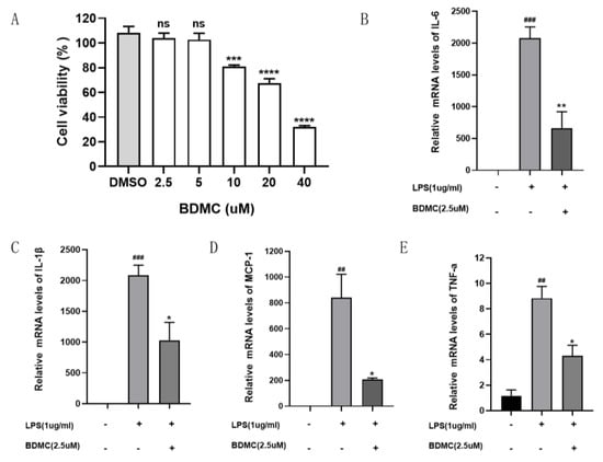 (A) BDMC as indicated. Cell viability was determined by CCK8 assays. Data are presented as the mean ± SEM. *** p < 0.001, **** p < 0.0001 vs. vehicle control (DMSO). BDMC decreases the levels of proinflammatory factors (B–E). RAW264.7 cells were pre-treated for 1 h with 2.5 uM concentrations of bisdemethoxycurcumin and incubated with or without LPS (1 μg/mL) for 24 h. The expressions of IL−6 (B), IL−1β (C), MCP−1 (D), and TNF−a mRNA levels were examined by real-time PCR. Data are presented as the mean ± SEM. ## p < 0.01; ### p < 0.001 vs. control group; * p < 0.05; ** p < 0.01; *** p < 0.001; **** p <0.0001 vs. LPS group.