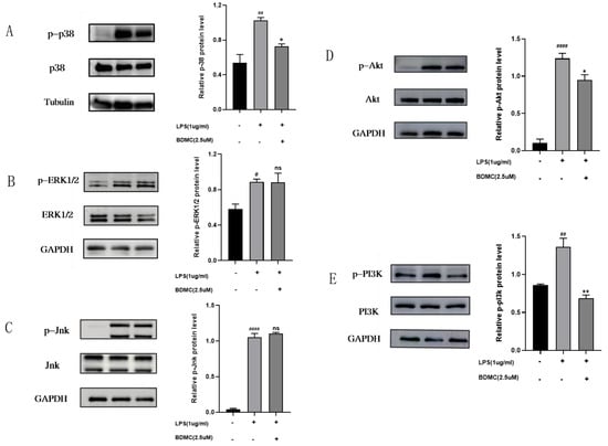 RAW264.7 cells were planted in 6-well plates at a density of 5 × 106 cells per well, pre-treated for 1 h with BDMC and LPS treatment with 1 μg/mL, or left untreated for 24 h. The Western blot was performed exactly as previously described [22]. Primary antibodies of GAPDH, Tubulin, p-Akt, Akt, p-pI3K, pI3K, p-JNK, JNK, p-ERK1/2, ERK1/2, p-p38MAPK, and p38MAPK were purchased from Cell Signaling Technology (Danvers, MA, USA). The findings were presented as means ± S.E.M. GraphPad Prism 8.0.2 was used to analyze the results, and the data comparison of multiple groups was analyzed by Ordinary one-way ANOVA. A p value of less than 0.05 was considered statistically significant.
