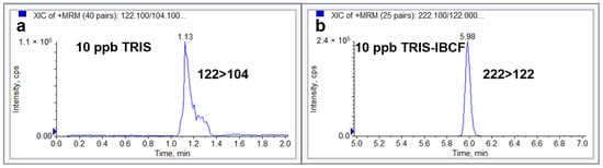 The chromatographic peak shape of TRIS before (a) and after derivatization (b) with IBCF at 10 ng/mL.