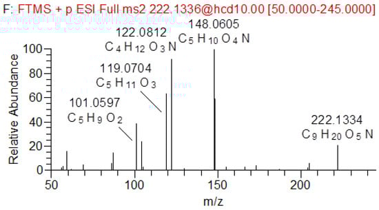 The positive ESI-MS/MS spectrum of TRIS derivatized with IBCF contained several product ions at m/z 204, 148, 122, 119, 104 and 101. Fragmentation pattern of protonated TRIS-IBCF and plausible ion structures are depicted in Figure S1. One of the two most intense product ions in the ESI-MS/MS spectrum was observed at m/z 148 and corresponded to the loss of isobutanol from the [M + H]+ 222 precursor ion. The second of the most intense product ions was at m/z 122 (intact TRIS), generated by a loss of the isobutyl formate moiety. These two specific MRM transitions (m/z 222→122 and m/z 222→148) had a signal intensity ratio of ~1:3.5 and a defined retention time (RT = 5.98 min) and were selected for detection and verification. All the observed QTRAP-MS/MS (MS2) product ions (Figure S1) were supported by Orbitrap-ESI-MS2 exact mass measurements (<3 ppm error), enabling detailed structural elucidation of the TRIS-IBCF derivative. The Orbitrap-ESI-MS2 spectrum of the TRIS-IBCF derivative is shown in Figure 3.