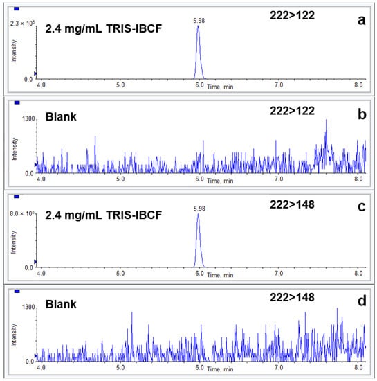 Representative MRM chromatograms of 2.4 mg/mL TRIS-IBCF in the vaccine formulation: a quantifier MRM chromatogram 222→122 (a) and a qualifier MRM chromatogram 222→148 (c) along with a blank MTRX (vaccine formulation without Tris ((b,d), corresponding to (a,c)).