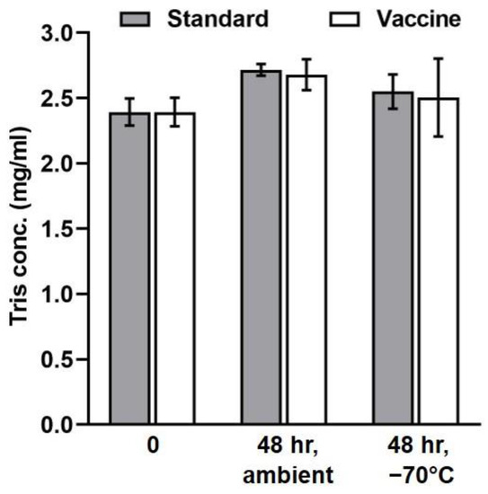 Stability of TRIS-IBCF at ambient temperature for 48 hr. A standard solution and a vaccine preparation were derivatized in triplicate. The derivates were split into two equal samples stored at −70 °C and ambient temperature. The derivates were then analyzed by RP-LC-ESI-MS/MS, and the TRIS concentration in these samples was determined both at zero time and after 48 h. Error bars are ± 1 standard deviation.