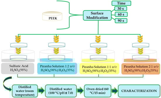 First, PEEK rods (TECAPEEK, Classix White Victrex®) for medical-technical applications (Ensinger, São Leopoldo, Brazil) were sectioned using a horizontal mechanical Imor® lathe (São Paulo, Brazil), obtaining cylindrical specimens (20.0 mm diameter and 8 mm thick). Then, a metallographic PLO2 E Teclago® polishing machine (São Paulo, Brazil) was utilized to wet-grind the sample with 600-, 1200-, and 2000-grit aluminum carbide sandpaper (Deerfos Abrasivos, Maringá, Brazil). Wet-ground specimens were ultrasonically cleaned in a distilled water (electric conductivity 0.8 µS/cm) bath for 10 min (Ultra Cleaner 1440 plus Unique, São Paulo, Brazil) to remove the remaining abrasive particles on the surface. Subsequently, the samples were oven-dried at 60 °C for 20 min and afterward were etched in (i) 98% sulfuric acid P.A. (Dinâmica Química Contemporânea, São Paulo, Brazil) and (ii) 98% sulfuric acid and 35% hydrogen peroxide P.A. (Neon, São Paulo, Brazil), named piranha solution (H2SO4:H2O2 = 1:2, 1:1 and 2:1 w/v) for 30, 60, and 90 s (Table 1). The specimens were rinsed repeatedly with distilled water at room temperature and subsequently washed with distilled water at 100 °C until the complete removal of sulfuric acid (pH ≅ 7.0), ensuring no residual acid in the sample, as described previously [20,21]. The pH measurements were conducted with a Q400A pH meter (QUIMIS, São Paulo, Brazil). Figure 1 shows a schematic diagram of the method used for sample preparation.