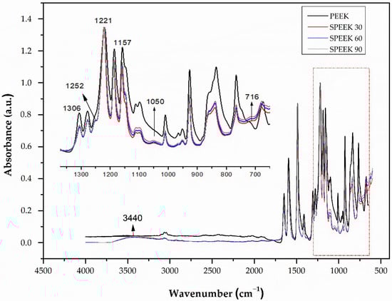 The main structures of SPEEK and PEEK are similar. However, it is possible to identify differences in all investigated SPEEK samples. The bands related to the SPEEK spectrum present sulfonic acid groups at 3440, 1252, 1050, and 716 cm−1 [20]. The wideband at 3440 cm−1 belongs to the –OH vibration of the sulfonic acid functional group (SO3H) (occurring exclusively in the oxy-1,4-henyleneoxy rings) [RS(=O)2–OH] [17]. The vibration at 1050 cm−1 corresponds to the symmetrical stretching of the S=O bond, and the vibration at 1252 cm−1 is the asymmetric stretching of O=S=O [21]. The vibration at 716 cm−1 corresponds to the symmetrical stretching of the S–O bond [31,32]. It was also observed that the intensity of these bands increased with increasing sulfonation time.