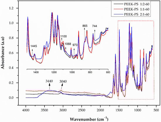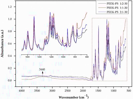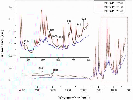 FTIR studies were performed to detect any chemical bonding between PEEK, SPEEK, and PEEK-PS using a Perkin Elmer Spectrophotometer Spectrum 400 (Waltham, MA, USA) equipped with an attenuated total reflectance (ATR, ZnSe Crystal) accessory in the absorbance mode. The FTIR analysis applied a scanning range in the average infrared region of 4000 to 650 cm−1, working with 32 scans and with a resolution of 4 cm−1.