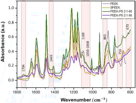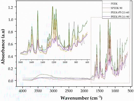 Comparative FTIR spectra of PEEK, SPEEK 90, PEEK-PS 2:1-60, and PEEK-PS 2:1-90, showing an enlargement of the region of 1800 to 550 cm−1.