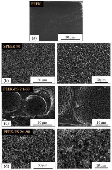 Comparison between surface micrographs of PEEK (a), SPEEK 90 (b), PEEK-PS 2:1-60 (c), and PEEK-PS 2:1-90 (d) with different magnifications.