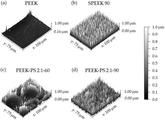 According to the results, the untreated PEEK sample (Figure 9a) had minimal surface roughness due to the lack of chemical surface treatment. PEEK-PS 2:1-60 (Figure 9c) showed irregular and heterogeneous topography compared to SPEEK 90 (Figure 9b) and PEEK-PS 2:1-90 (Figure 9d), which showed a homogeneous topography.