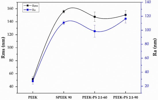 The functionalization effect of PEEK with sulfuric acid (SPEEK 90) is noticed as an increase in the Rms and Ra values compared to the PEEK samples. The Rms value increased from 52 ± 5 nm to 156 ± 3 nm compared to the untreated PEEK and H2SO4-functionalized samples (SPEEK 90). PEEK and SPEEK 90 presented mean roughness values of 27 ± 6 nm and 111 ± 3 nm, respectively (Figure 10).