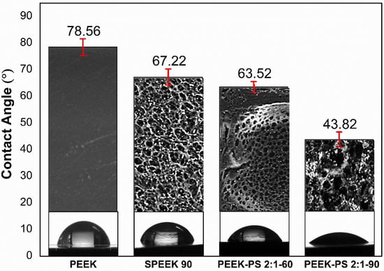 PEEK exhibited a contact angle of 78.56°, followed by SPEEK 90 (67.22°), PEEK-PS 2:1-60 (63.52°), and PEEK-PS 2:1-90 (43.82°). PEEK-PS 2:1-90 demonstrated a more hydrophilic surface, with a reduction of 44% when compared to the untreated PEEK, similar to that reported in the literature [19,20]. The introduction of the hydrophilic HSO3− functional group pointed by FTIR reflects the effect of the chemical modification on the PEEK surface, especially in the noticeable decrease in the PEEK-PS 2:1-90 sample contact angle, caused by the increase in the immersion time in the piranha solution.